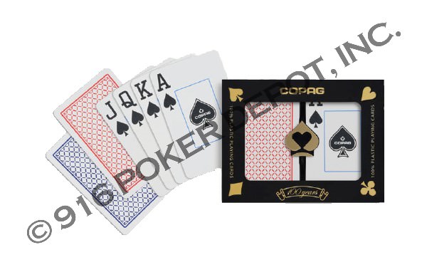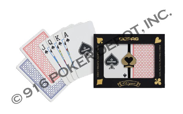 Red & Blue. Bridge size 2 1/4” x 3 1/2” jumbo index 100% plastic playing cards. Used by poker rooms around the world these cards are extremely player and dealer friendly. This product is only available to licensed casinos. Sold by the case 12 setups / 24 decks decks per case.