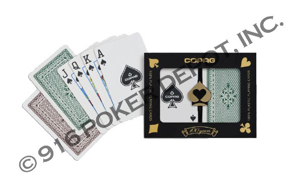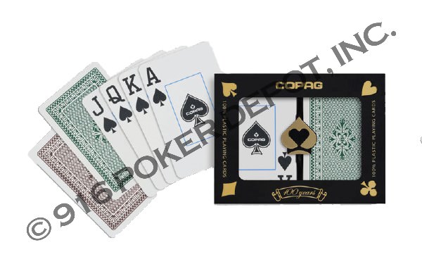 Green & Brown. Bridge size 2 1/4” x 3 1/2” regular index 100% plastic playing cards. Used by poker rooms around the world these cards are extremely player and dealer friendly. This product is only available to licensed casinos. Sold by the case 12 setups / 24 decks decks per case.