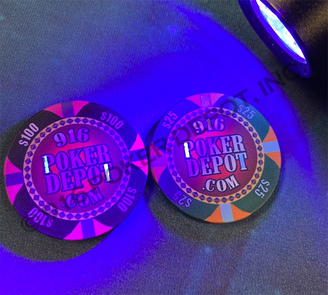 We have the ability to incorporate intricate UV images on the face and edge of our chips. A black light is then used to read the UV images to verify the authenticity of chip which provides an additional level of security. Products with our UV protection technology deter counterfeiting efforts. For a more sophisticated UV option we have the ability to add UV patterns and UV micro print to the chip faces for automated machine authentication.